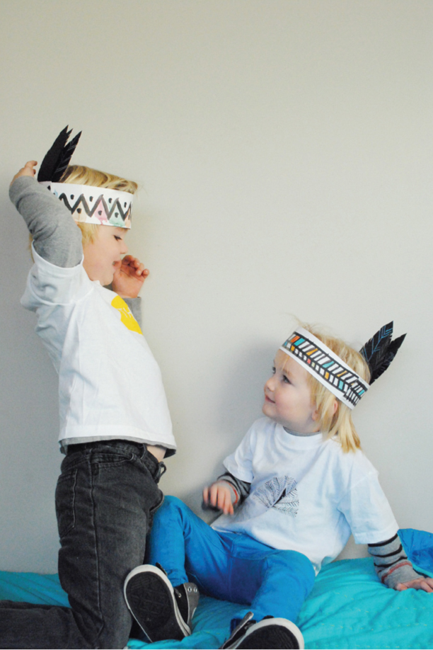 I printed the headbands out on a 13″x17″ sheet of bristol paper (but any sort of stiff cardstock/poster board paper should work). If you don’t have a large format printer, you can take this file to your local copy shop and have them print out of few for you. You’ll see on the template that I added a bit more of the pattern beneath as you’ll most likely need it to wrap fully around your child’s head. Once printed you can have your kids decorate the headbands with watercolors, crayons, colored pencils, you name it…basically whatever you kids are into and what makes things easy on you.